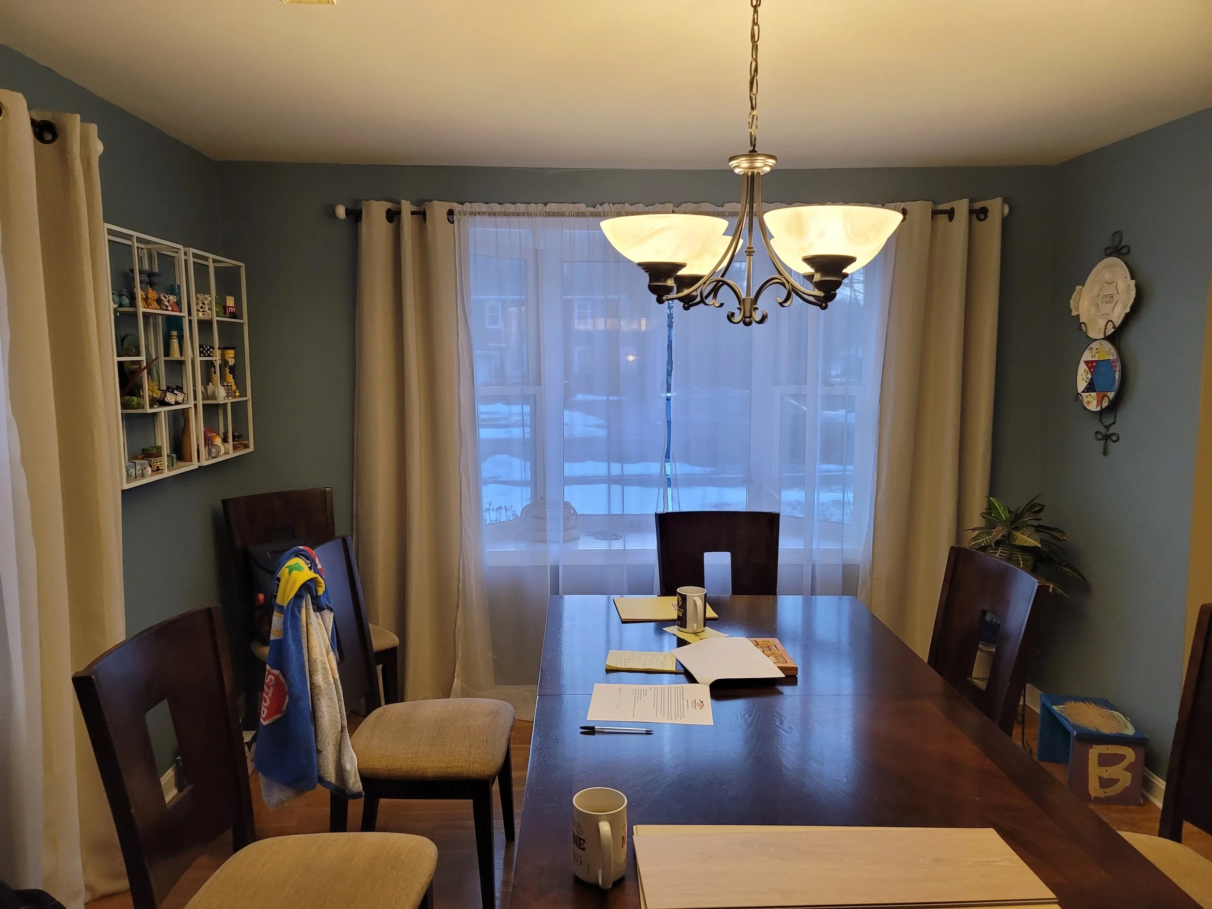 We updated this dining room with a soft, elegant Meditative Eggshell blue paint, new trim, and durable flooring—bringing together sophistication and practicality.