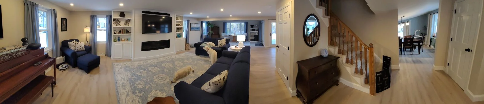 A wider view of the finished living room showing off the warm-toned luxury vinyl plank flooring, built-ins, and the relaxed, open-concept design—complete with a happy pup enjoying the new space.