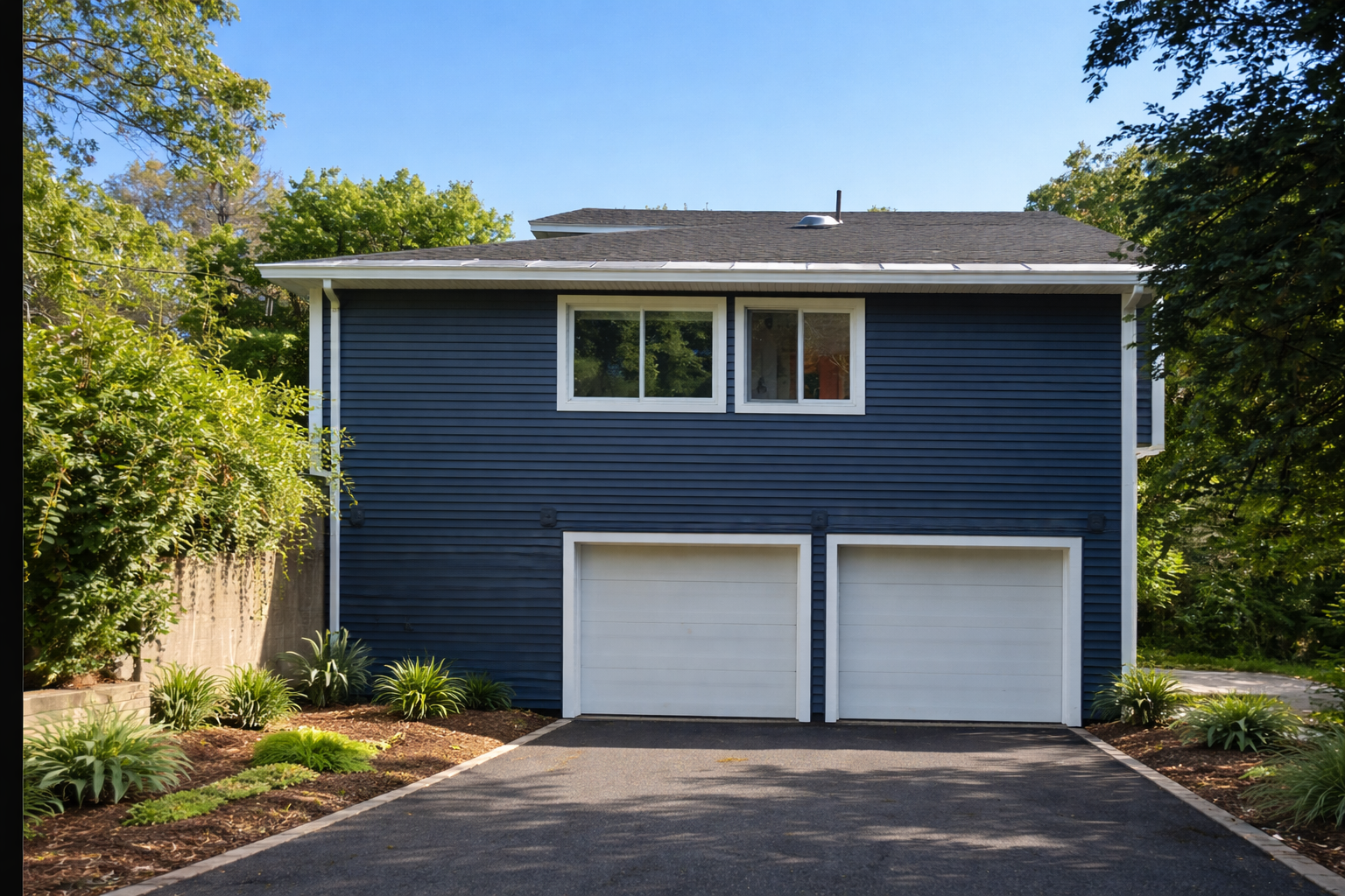 The garage exterior matches the home with new Pacific Blue siding and trim, tying the property together.