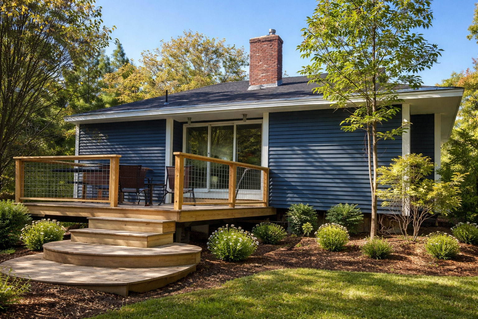 To complement the siding improvements, we also installed a new deck built with Trex composite decking and pressure-treated railings. This combination offers the natural look of wood with the lasting performance of composite materials, creating a safe, attractive, and low-maintenance outdoor living space.