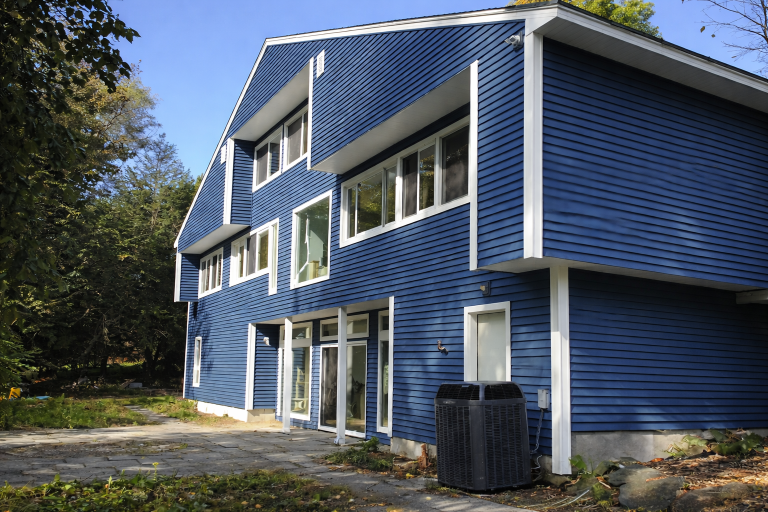 Fresh CertainTeed Monogram Pacific Blue vinyl siding transforms the Sherborn, MA home and garage for a crisp, modern look.