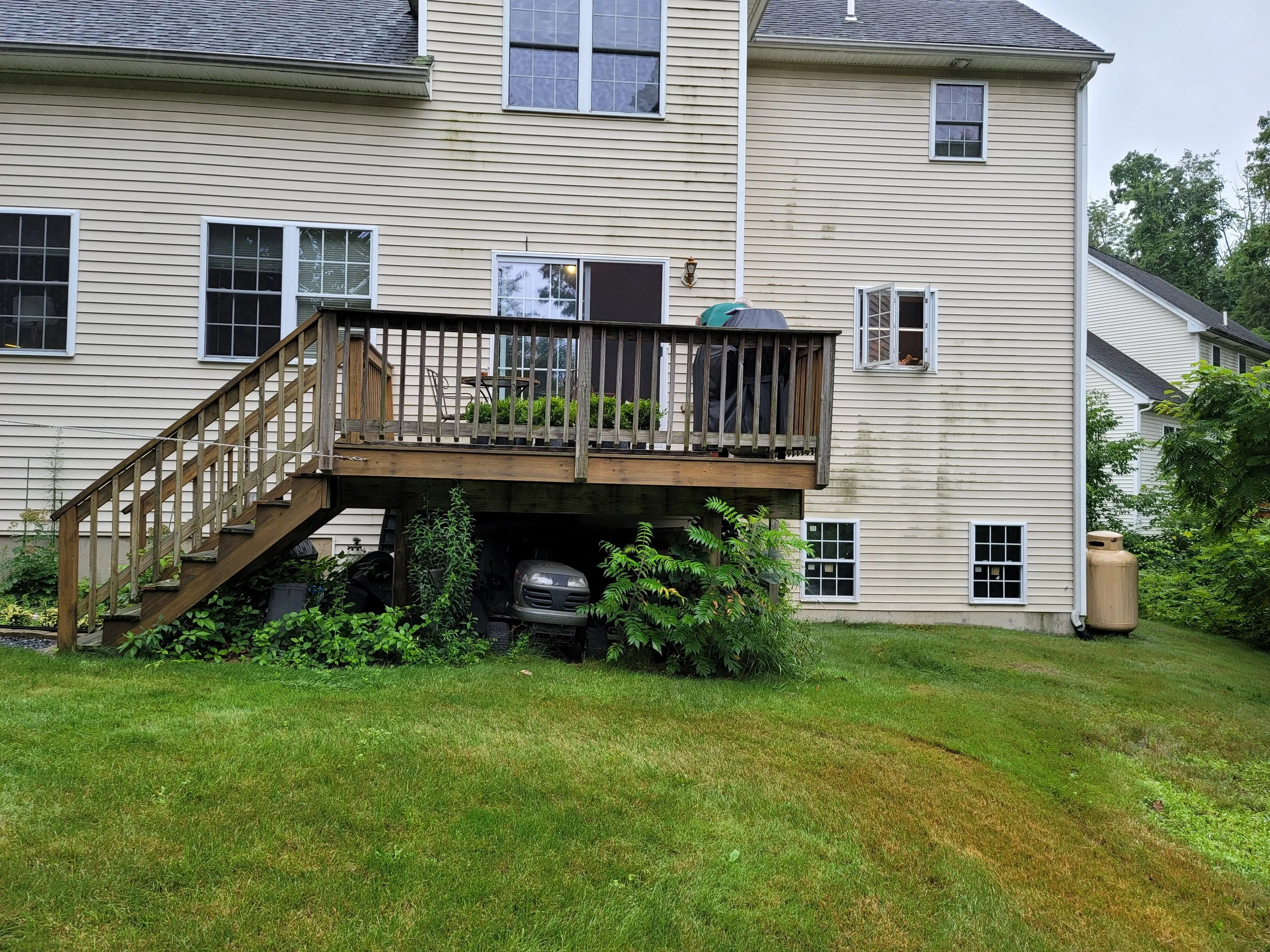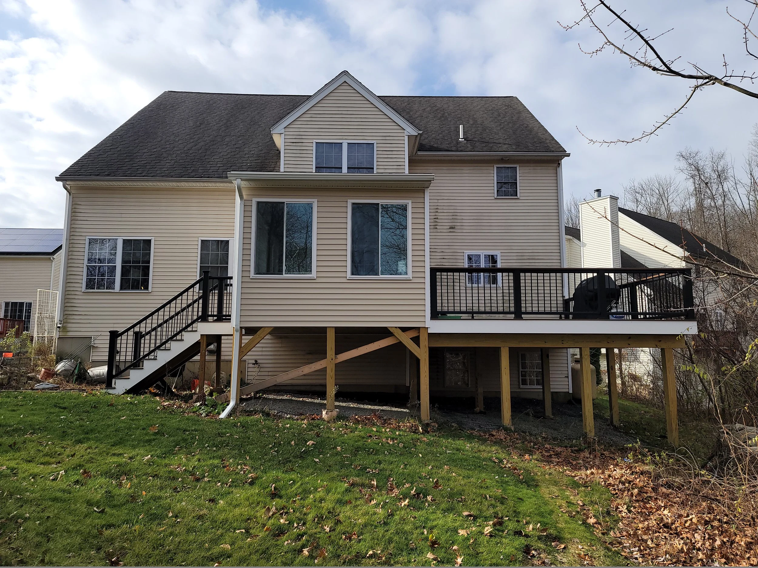 Framed 3-season room with knee walls and roofed with asphalt style shingles. The perimeter windows are Provia Gliding style windows with full screens. Two Provia Spectrum full view glass entrance storm doors with retractable better vue screens. We added exits from the 3-season room to the stairs and the other from the 3-season room to the open style deck. We plastered the walls and ceiling, and painted with custom chosen color. We framed deck according to final plans with one stairway to the ground and added a cocktail railing. The trex select decking is the color saddle with black trex transcend post, caps and railings. We installed a Monte Carlo 5 Bladed 44" indoor ceiling fan - blades with Monte Carlo 12" Down rod for Ceiling Fan and we installed MSI Prescott - luxury vinyl plank flooring.