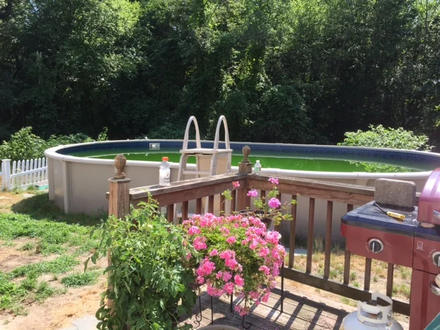 Multi-level pressure-treated pool deck with safe stair access and decorative lattice skirting.