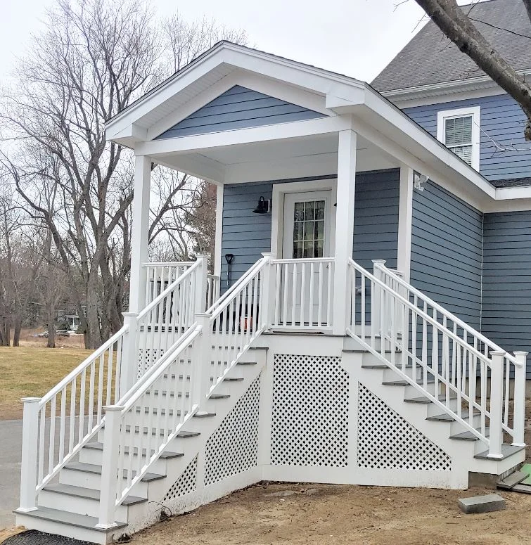 Outside, we installed ProVia energy-efficient windows and a new exterior door, upgraded the deck with TimberTech composite decking and white railings, and extended the roof over the stairs with a new Techno Post helical pile footing. The home’s exterior was finished with composite trim and Hardie board siding, along with new rain gutters for improved drainage.